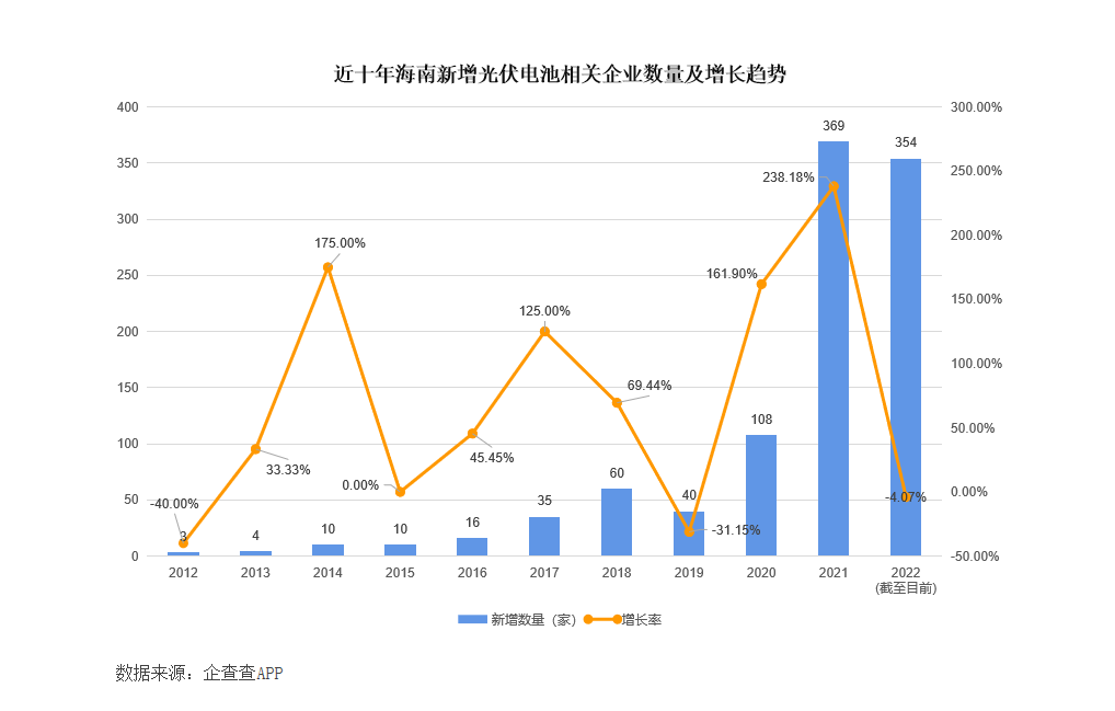 近十年海南光伏電池相關(guān)企業(yè)保持增長態(tài)勢,增速較為波動。其中,2021年海南新增光伏電池相關(guān)企業(yè)369家,同比增幅達238.18%,是近十年來增速最快的一年;2022年新增企業(yè)數(shù)量持續(xù)攀升,截至發(fā)稿前,新增數(shù)量達到354家。