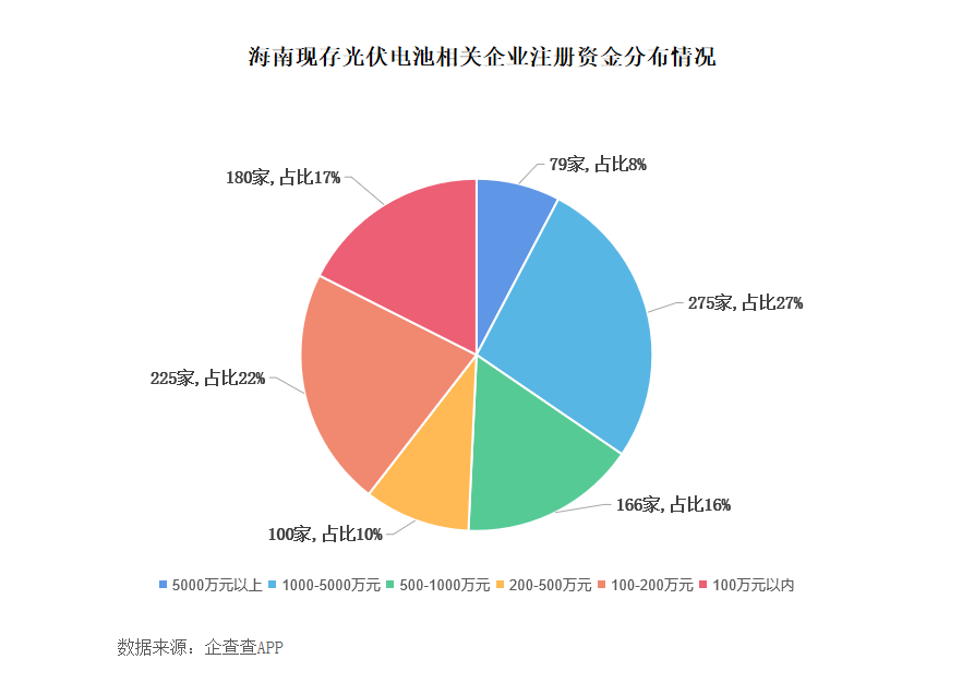 從注冊資金分布情況來看,海南現(xiàn)存光伏電池相關(guān)企業(yè)中,注冊資金在1000~5000萬元區(qū)間的企業(yè)最多,有275家,占比27%;其次,是注冊資金在100~200萬元之間的,有225家,占比22%;注冊資金超5000萬元的企業(yè)有79家,占比8%。