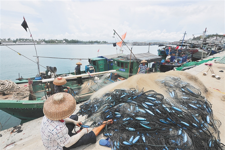 萬寧港北港漁民在修補漁網。 海南日報記者 袁琛 攝