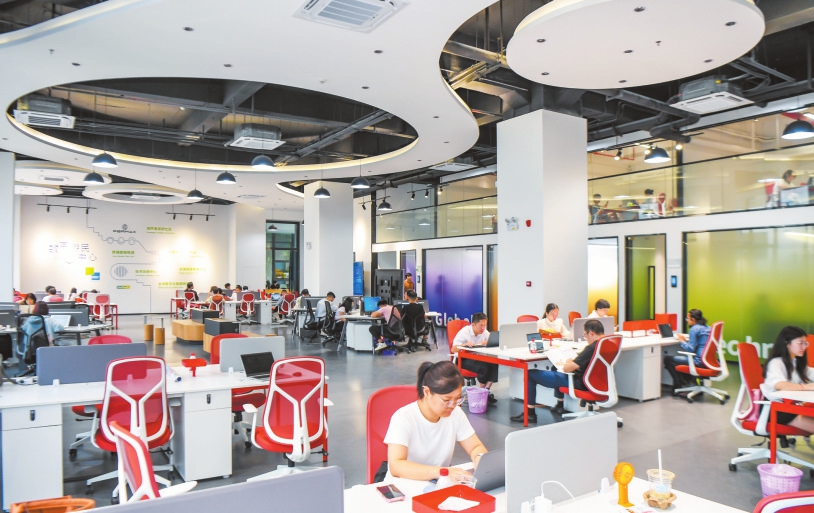 復(fù)興城跨境數(shù)據(jù)產(chǎn)業(yè)服務(wù)基地工作人員在崗位上忙碌。??谌?qǐng)?bào)記者 康登淋 攝