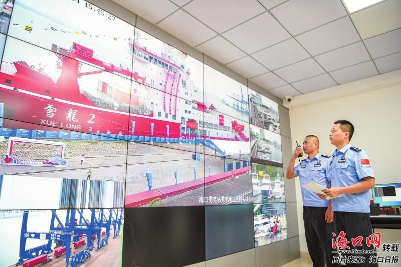 6月4日,在秀英出入境邊防檢查站,邊檢人員通過港口碼頭視頻監(jiān)控系統(tǒng)協(xié)調(diào)指揮工作。記者 蘇弼坤 攝